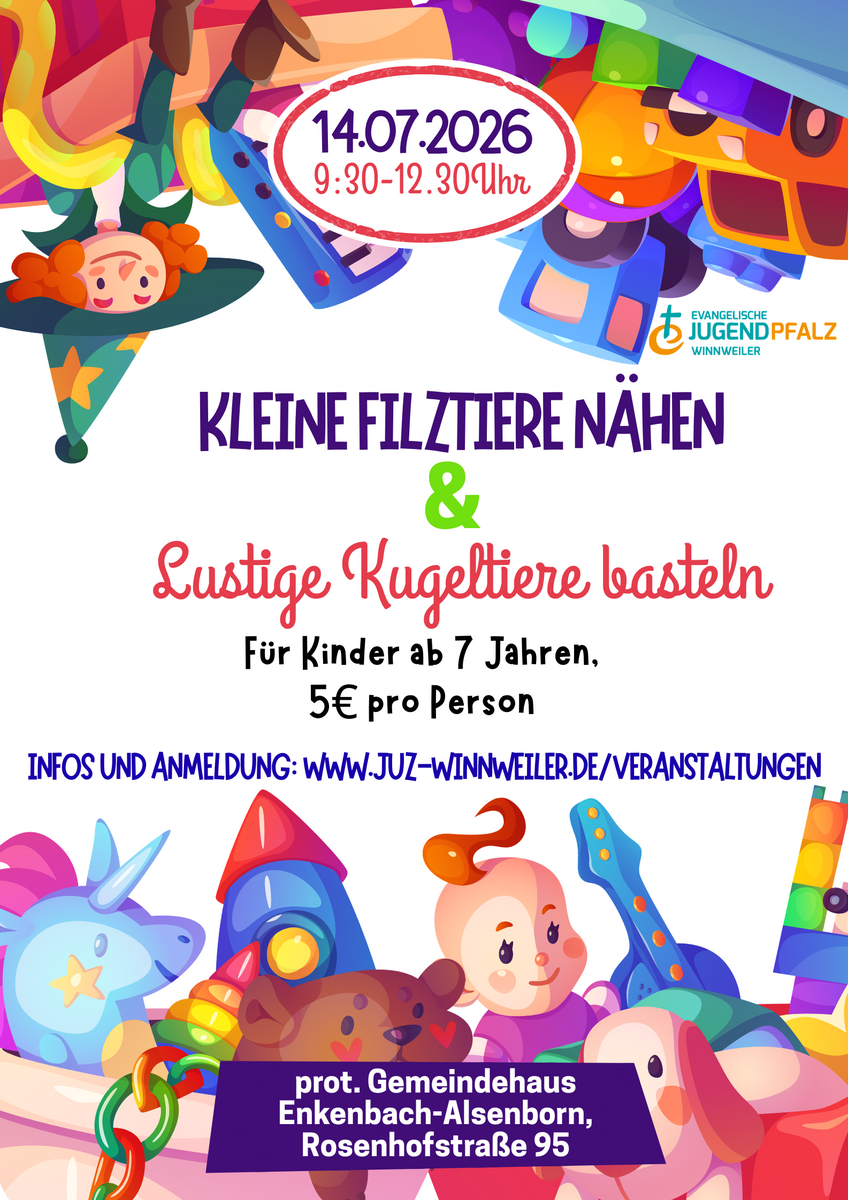 Wir wollen am 14. Juli von 9.30-12.30 im Gemeindehaus in Alsenborn, Rosenhofstraße 95, gemeinsam kleine Filztiere nähen und lustige Kugeltiere basteln.